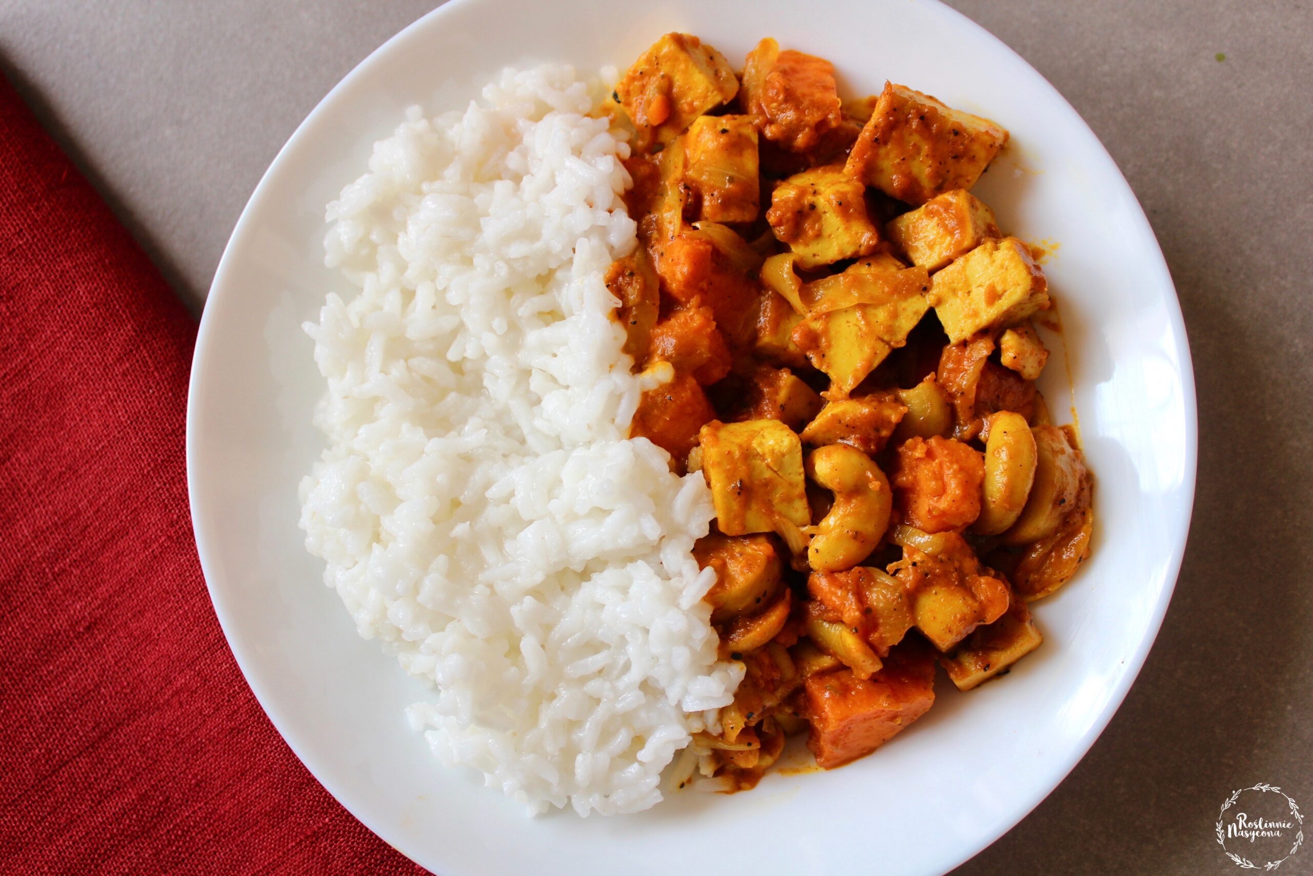 - W międzyczasie obierz batata i pokrój w kostkę i dorzuć na patelnię. Smaż przez ok. 3-5 minut co jakiś czas mieszając. Dodaj pokrojone w kostkę tofu i nerkowce, 800 ml mleka kokosowego i wszystkie przyprawy i duś przez ok. 20-30 minut. Kiedy bataty będą idealnie miękkie curry jest gotowe. Na koniec spróbuj potrawy i dopraw solą i pieprzem (ja dałam jeszcze 0,5 łyżeczki soli i odrobinę pieprzu.