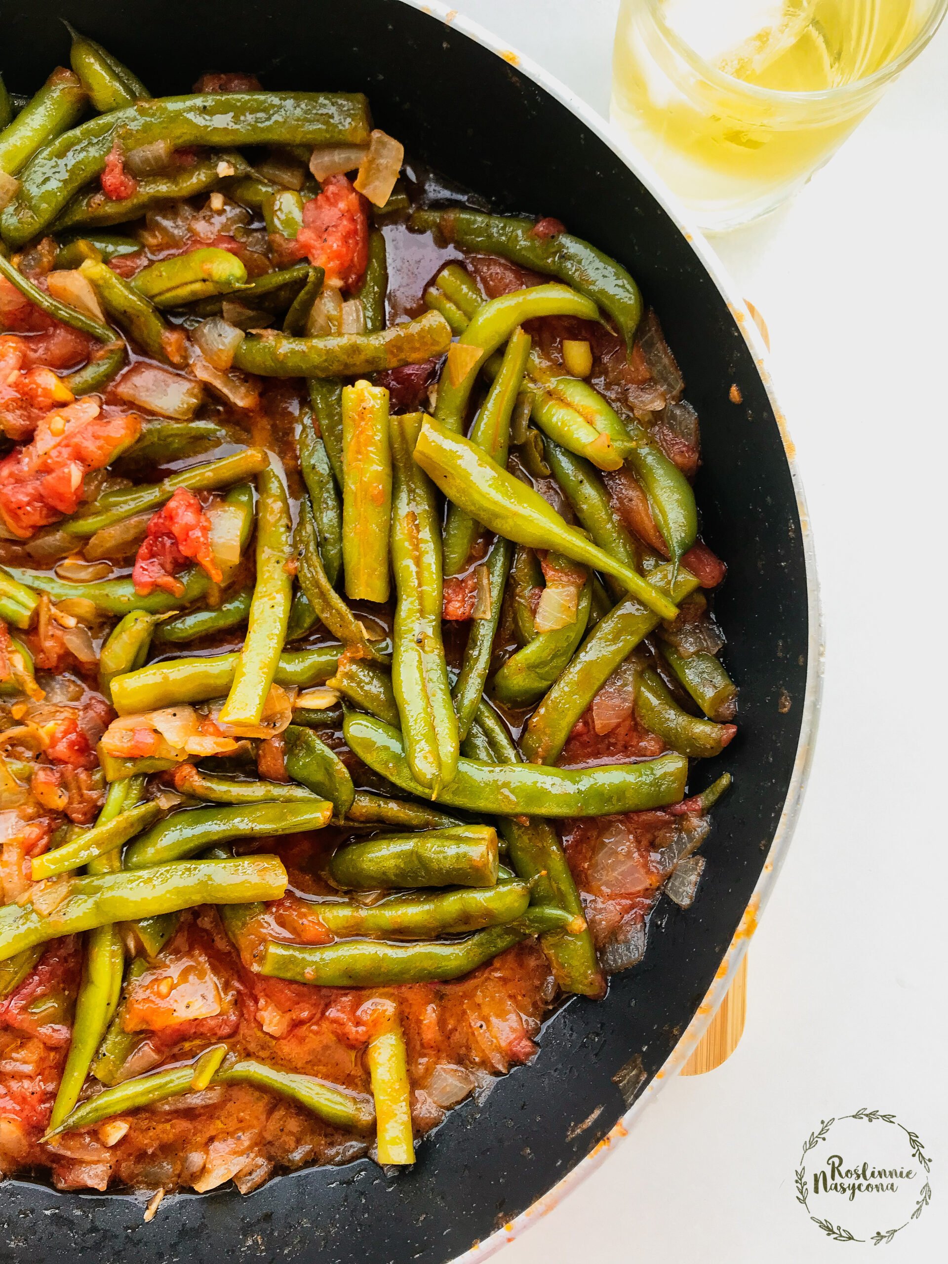 - Fasolakia jest gotowa kiedy wyparuje z niej praktycznie cała woda i zostanie gęsty pomidorowy sos.