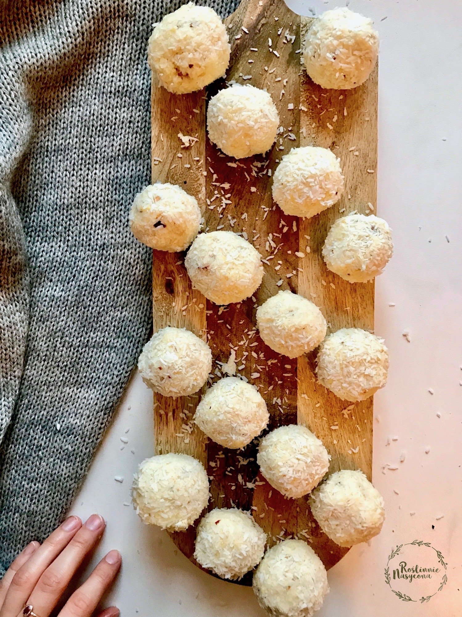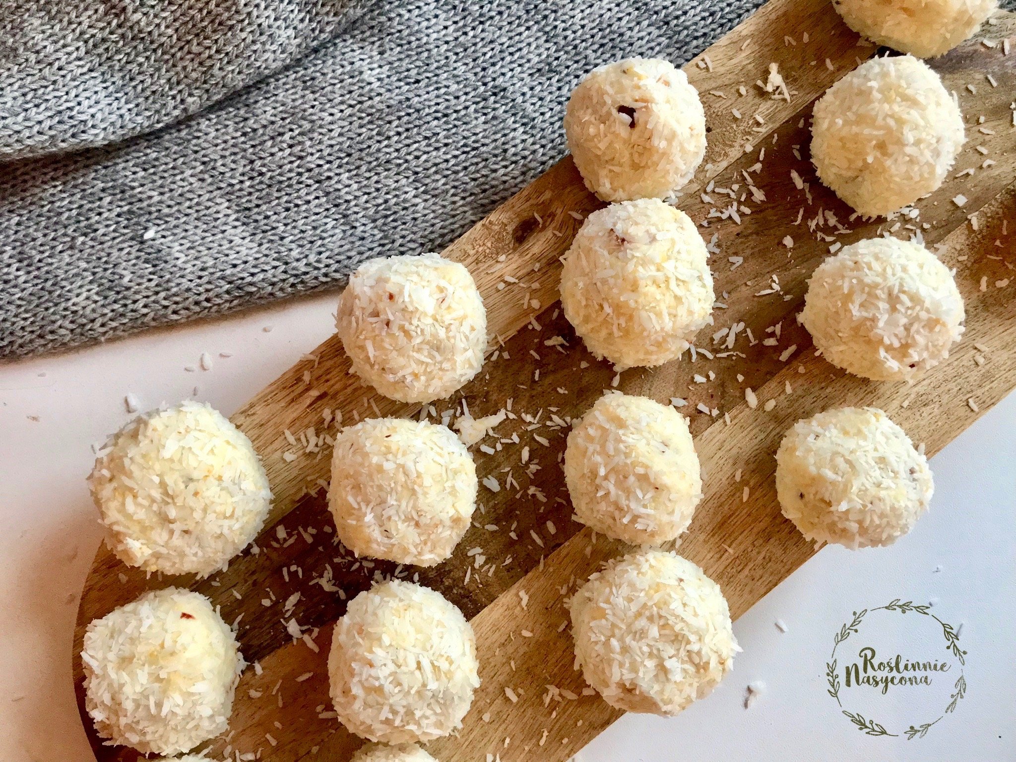 - Formuj kulki i obtaczaj je w wiórkach kokosowych.