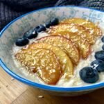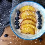- Na gotowej kaszy ułóż brzoskwinie i dodaj borówki. Gotowe! 🙂