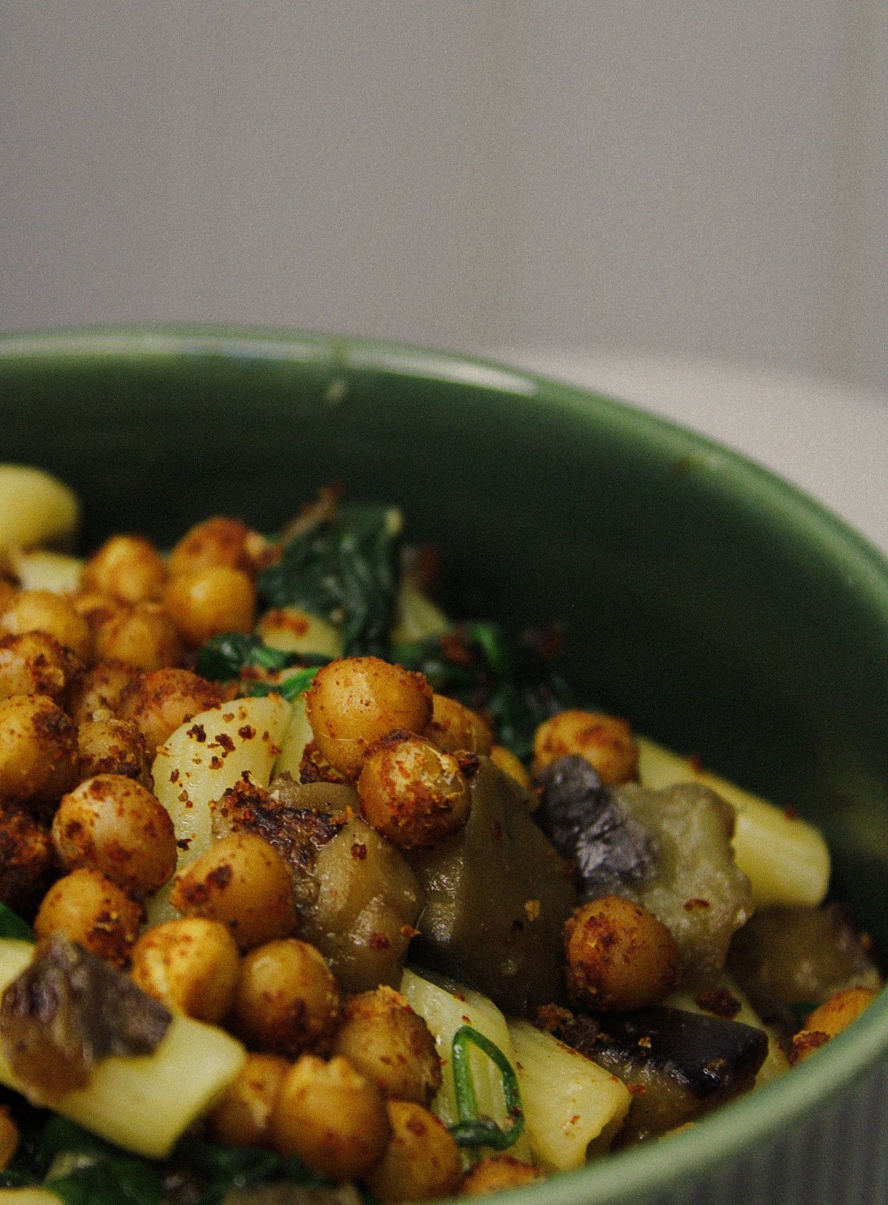 - Ciecierzycę wymieszaj z oliwą z oliwek, solą, pieprzem, wędzoną papryką, pieprzem cayenne, cynamonem, kuminem, granulowanym czosnkiem i płatkami drożdżowymi. Piecz ok 20 min w 200 stopniach.