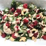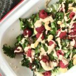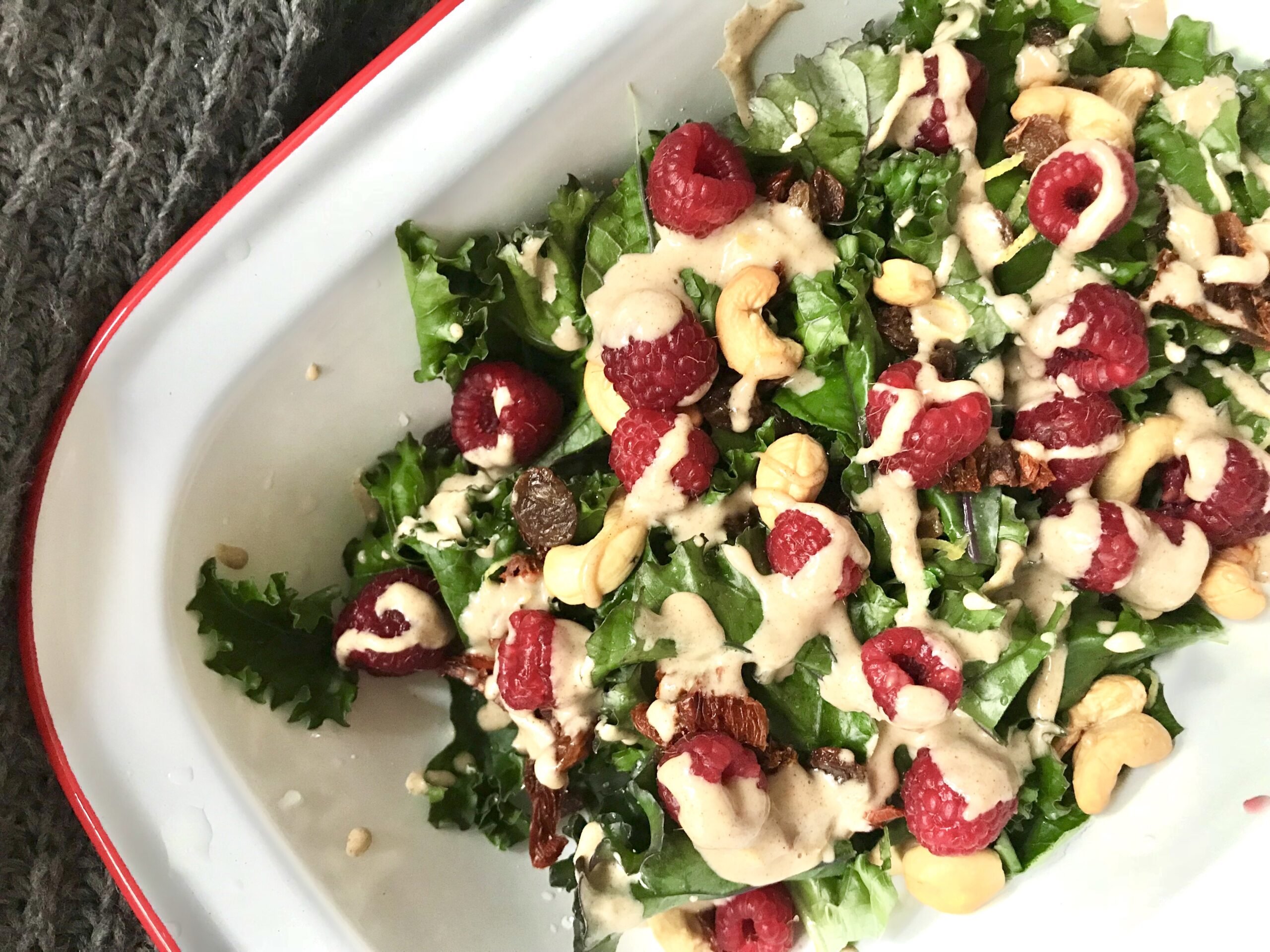 sałatka z jarmużem i malinami z cynamonowym sosem tahini