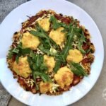 6. Gotowy spód do pizzy wysmaruj sosem, dodaj trochę cukinii startej na tarce (lub inne ulubione dodatki) i na końcu w kilku miejscach umieść “ser”. Tak przygotowaną pizzę piecz przez ok. 30 minut. Smacznego!